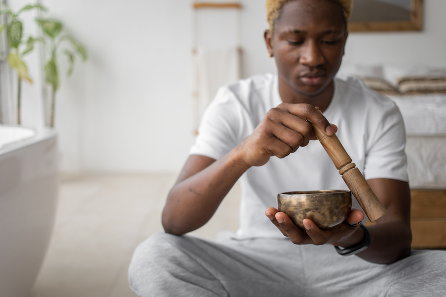 Keep in mind that “no distractions” doesn’t mean completely quiet! Relaxing music or a meditative experience like a sound bath may help to get you in the right frame of mind.